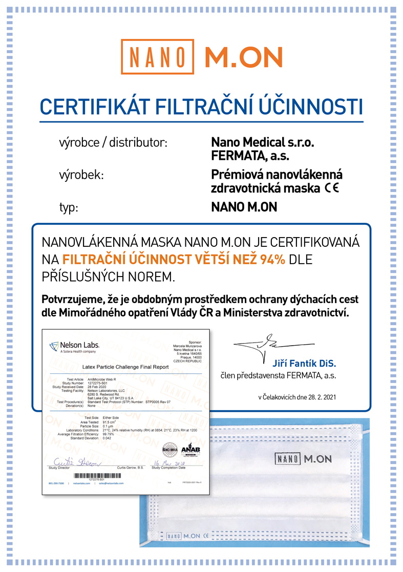 dle platného Mimořádného opatření Vlády ČR pro ochranné prostředky dýchacích cest. Filtrační efektivita roušky NANO M.ON odpovídá hodnotám pro FFP2 a v některých ohledech ochranné vlastnosti FFP2 převyšuje.