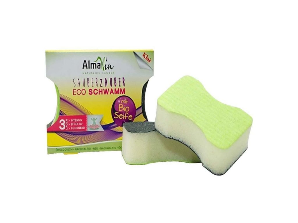 ALMAWIN Eco Houba na nádobí 2 ks je ekologický pomocník, který si hravě poradí s horou nádobí i s velkým úklidem. Eco houbička se skládá ze tří vrstev: tmavá, drsná vrstva z ocelové vlny je napuštěna mýdlem z bio mýdlových ořechů pro odstranění odolné či zaschlé špíny. Střed houbičky s certifikací Eco-Tex obsahuje více než 70 % slunečnicového oleje. Zelená vrstva z měkkého flísu je vyrobena z bavlny a je vhodná na šetrné čištění hladkých povrchů, choulostivých na poškrábání. Obsah mýdla lze snadno doplnit.