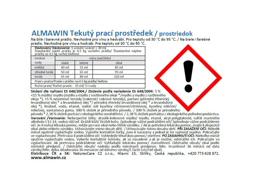 Dávkování: Dávkujte přímo do bubnu. Na zvlášť odolné skvrny použijte ALMAWIN Bělidlo. Praní v pračce: Dávkujte po uzávěrech (1 uzávěr = 30ml) dle tvrdosti vody a intenzity zašpinění (viz obal). Ruční praní: 15ml prostředku rozřeďte v 5 litrech vody.