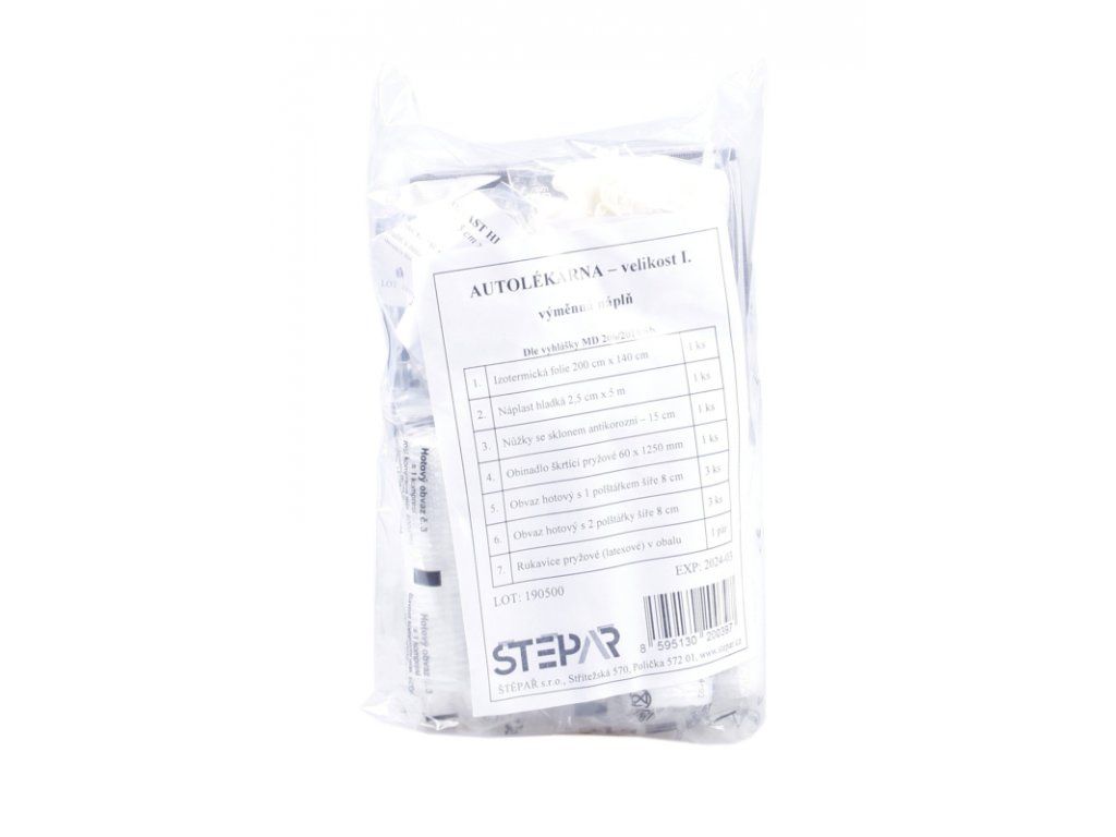 Výměnná náplň autolékárničky v PE sáčku. Vhodné pro ty, kteří mají vyhovující obal na lékárničku. Obsah autolékárničky odpovídá vyhlášce č. 206/2018 Sb. Platnost 52 měsíců.