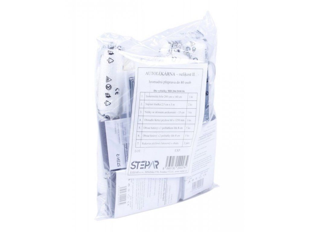 Náplň autolékárničky je určená pro vozidla pro hromadnou přepravu osob s obsaditelností od 9 do 80 cestujících včetně, tj. autobusy, vlakové vozy, lodě atp. Lékárnička dle aktuální vyhlášky č. 206/2018 Sb. maximální možnou expirací. Náplň je uložená v PE sáčku.