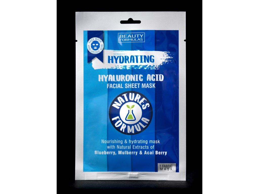 Hydratační pleťová maska Beauty Formulas Hydrating Facial Sheet Mask s přidanou kyselinou hyaluronovou pro intenzivní hydrataci pokožky.