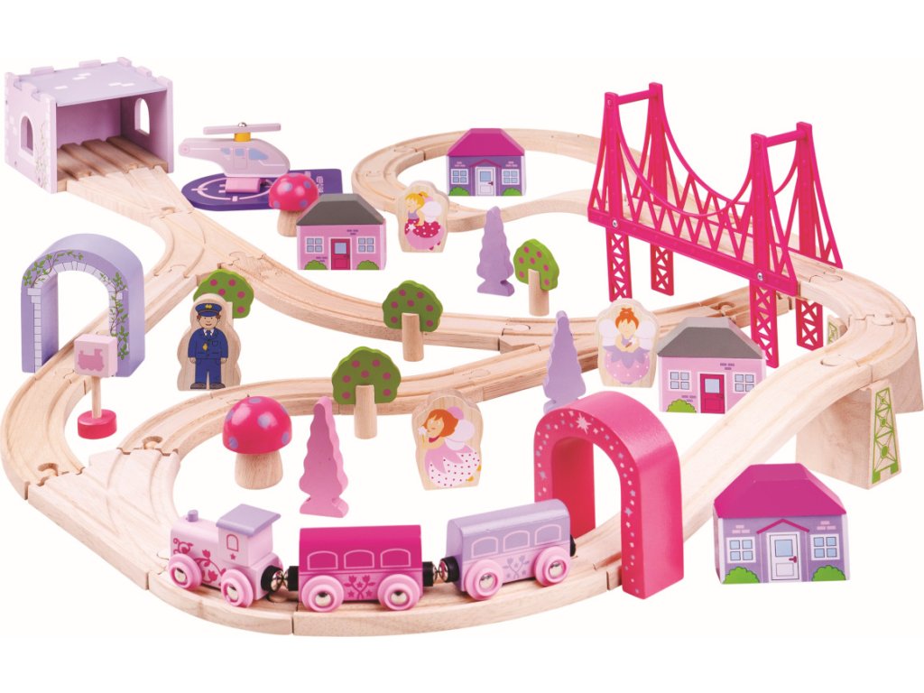 Originální vláčkodráha nejen pro malé slečny s veškerým příslušenstvím, 75 kusů v odstínech růžové a fialové. Hlavní vlastnosti: vláčkodráhy a jejich příslušenství značky Bigjigs Rail lze kombinovat se všemi ostatními dřevěnými železničními drahami na trhuvyrobeno z kvalitních a zodpovědně získaných přírodních materiálůodpovídá současným evropským bezpečnostním normámpodporuje představivost, obratnost a koordinaci
