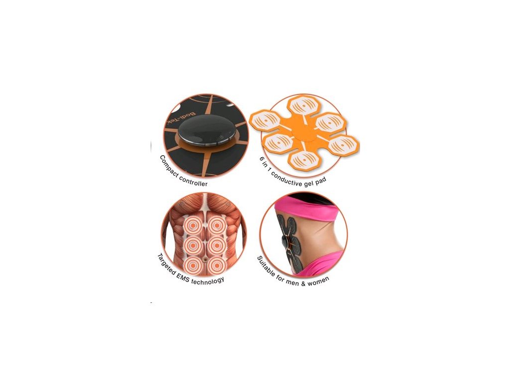 * elektrostimulátor * 6v1 podložkové jádro * poskytuje cílené cvičení pro posílení břišních svalů * cvičící program je na 23 minut, postupně se zvyšuje intenzita cvičení v několika fázích * automaticky se zastaví, když je cvičení dokončeno * 15 úrovní intenzity * může být použit diskrétně pod oblečením, trénink je tedy možno dělat kdykoliv * vhodné pro muže i ženy * vhodný pro všechny velikosti pasu * EMS (Electrical Muscle Stimulation): 25Hz * napájení: 1 x CR2032 (součástí balení)
