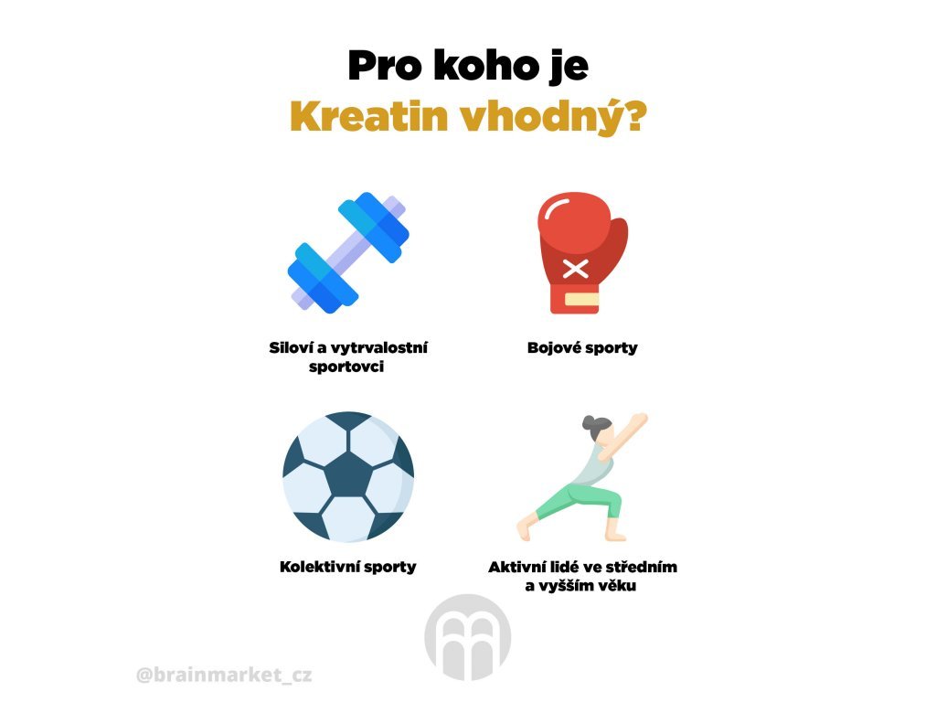 Kreatin znají zejména návštěvníci posiloven. Jeho užití je však mnohem širší. Bojové sporty, sprinty, kolektivní sporty. Tam všude má kreatin své místo. Ale nejen tam. Kreatin je úzce spjat se silou a kondicí svalů. A každý člověk potřebuje sílu pro každodenní plnohodnotný pohyb a radost z něj. Vyšší síla a zdravé svalstvo znamenají jistotu v pohybu. Ta je pro mnohé, hlavně starší lidi klíčově důležitá i ze zdravotního hlediska. Nízká svalová síla např. zvyšuje riziko pádů. Každodenní konzumace kreatinu může zvýšit účinek tréninku na sílu svalů jak u mladých sportovců, tak u dospělých osob ve věku nad 55 let.