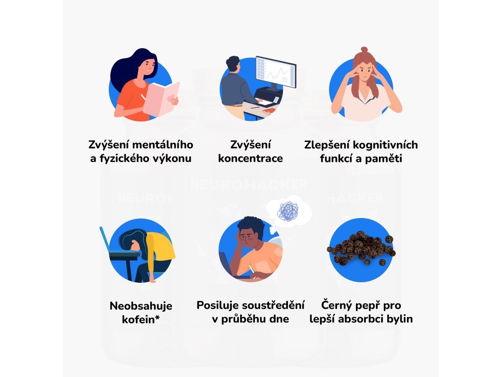 V Neurohackeru navíc zůstaly byliny s prokazatelnými účinky na mozek v čele s Ginkgo bilobou, Bacopou monieri a Gotu kolou. Ginkgo biloba je skutečným dotekem přírody, protože pracuje v náš prospěch. Posiluje funkce mozku jako je paměť a soustředění. Podporuje totiž krevní oběh a kromě toho i duševní rovnováhu, prokrvení končetin a působí jako účinný antioxidant. Komplex uzavírá extrakt z černého pepře, který zvyšuje absorpci všech zmíněných látek.
