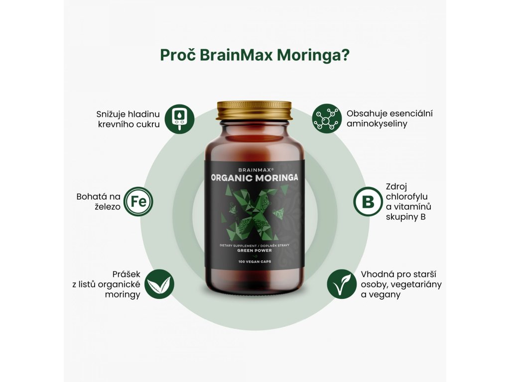 Moringa představuje přírodní zdroj antioxidantů a bioaktivních rostlinných sloučenin, které prokazatelně snižují hladinu krevního cukru.1,2 Každá kapsle obsahuje 500 mg prášku z listů moringy a je ideální pro vegetariány, vegany, osoby s nadměrným stresem, starší osoby a osoby v rekonvalescenci.