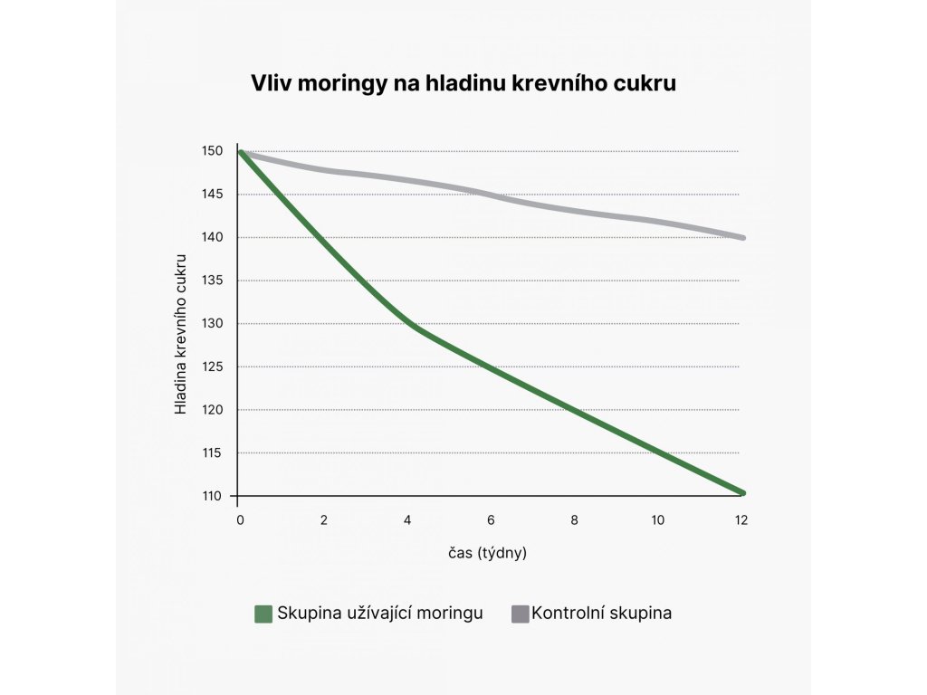 Aktivní složky obsažené v moringových listech, jako jsou isothiokyanáty a flavonoidy, mají významný vliv na metabolismus glukózy. Tyto složky zvyšují citlivost na inzulín a podporují efektivnější využití glukózy v buňkách, což vede ke snížení hladiny cukru v krvi. Graf znázorňuje změnu hladiny krevního cukru v obou skupinách během 12 týdnů. Zelená křivka představuje skupinu užívající moringu a šedá křivka kontrolní skupinu. Z grafu je patrné, že skupina užívající moringu má výraznější pokles hladiny krevního cukru. 1