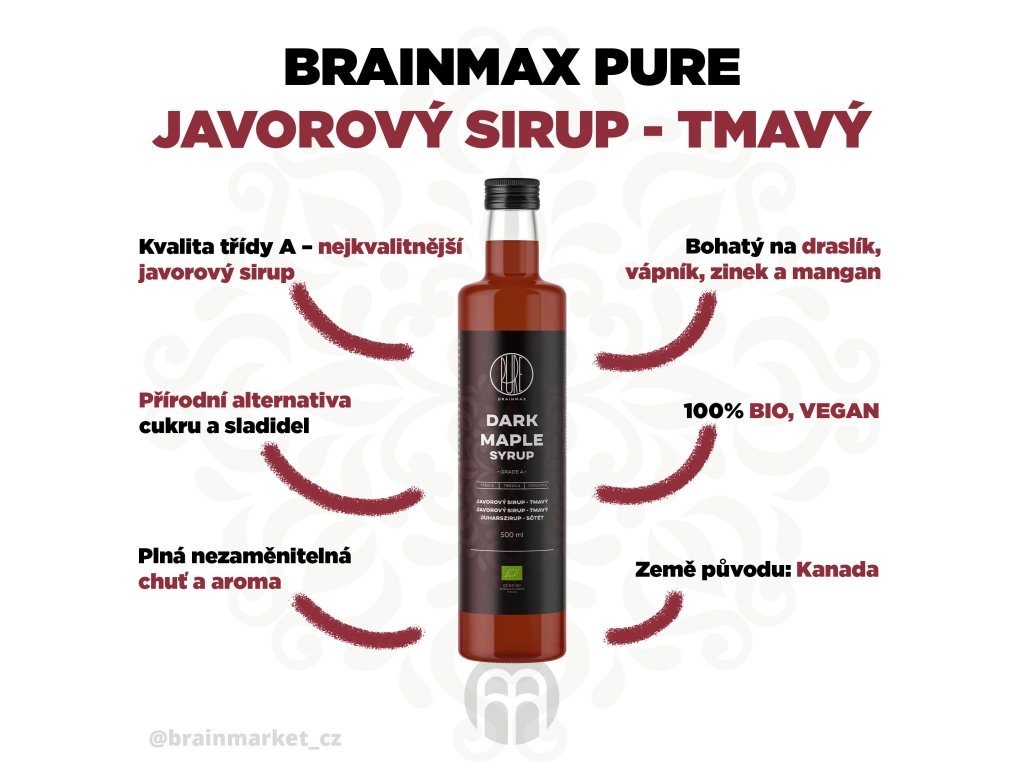 Javorový sirup obsahuje mnohem více antioxidantů než jakákoliv jiná alternativní sladidla. Z minerálních látek je bohatý především na zinek, draslík, vápník a mangan. Zinek je důležitý pro náš imunitní systém a hraje roli také v kvalitě naší pokožky a nehtů. Mimo to je javorový sirup bohatý na mnoho zdraví prospěšných sloučenin jako je například quebekol. BrainMax Pure Javorový sirup je produkt ekologického zemědělství a může sloužit jako komplexní sladidlo, ale také s ním můžete osladit wafle, palačinky nebo zmrzlinu.