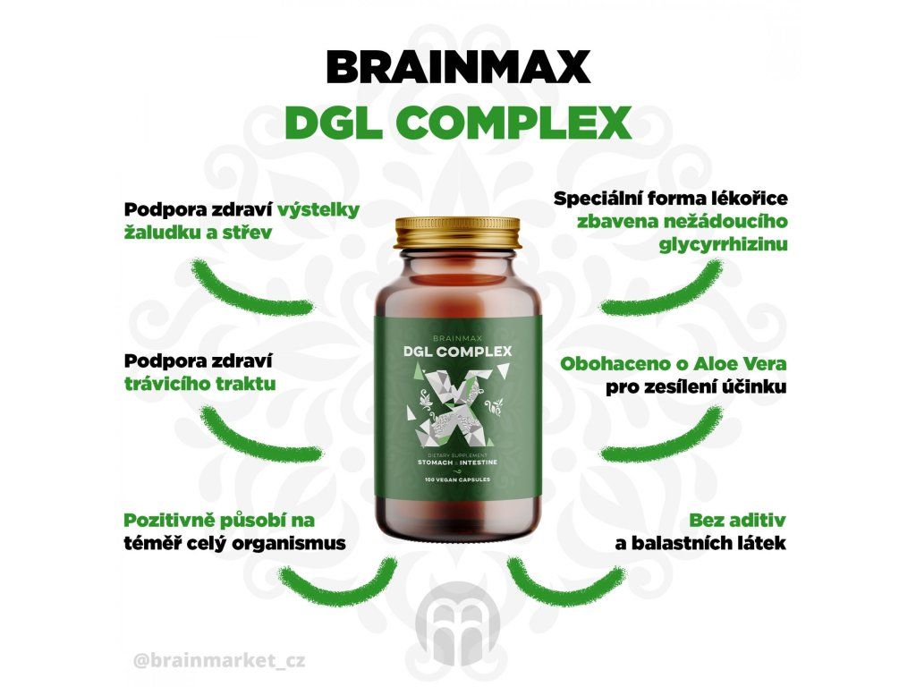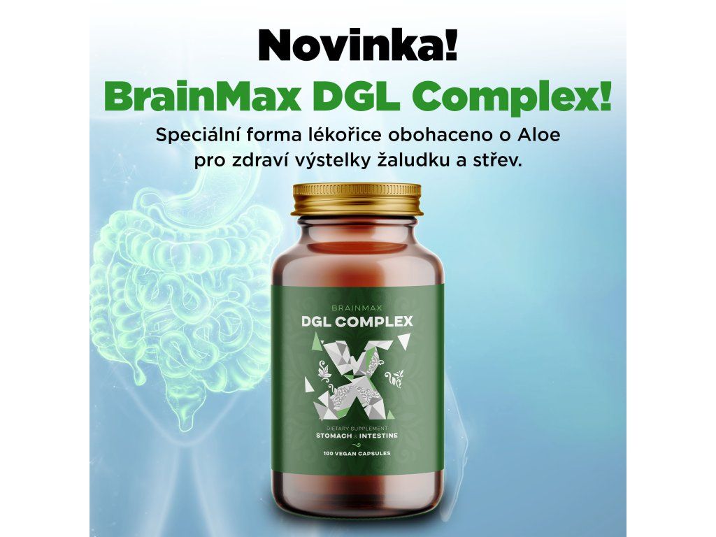 Lékořice obsahuje dvě kyseliny. Kyselinu glycyrrhizinová a glycyrrhetinová, které mohou při dlouhodobém používání mít vedlejší účinky. Mezi nejčastější patří zvýšení krevního tlaku, snižování hladiny draslíku nebo výskyt otoků. BrainMax DGL je extrakt z lékořice, ze které jsou odstraněny kyselina glycyrrhizinová a glycyrrhetinová a je tak bezpečnější volbou i pro dlouhodobé užívání bez nežádoucích účinků. BrainMax DGL Complex je doplněn o organický koncentrát Aloe Vera, který se podílí na zdraví a regeneraci střevní výstelky, podporuje trávicí procesy a podílí se na zdraví gastrointestinálního traktu. Podobně jako lékořice je Aloe vera vhodná k uvolnění napětí a stresu, protože navozuje pocity klidu a uvolnění.