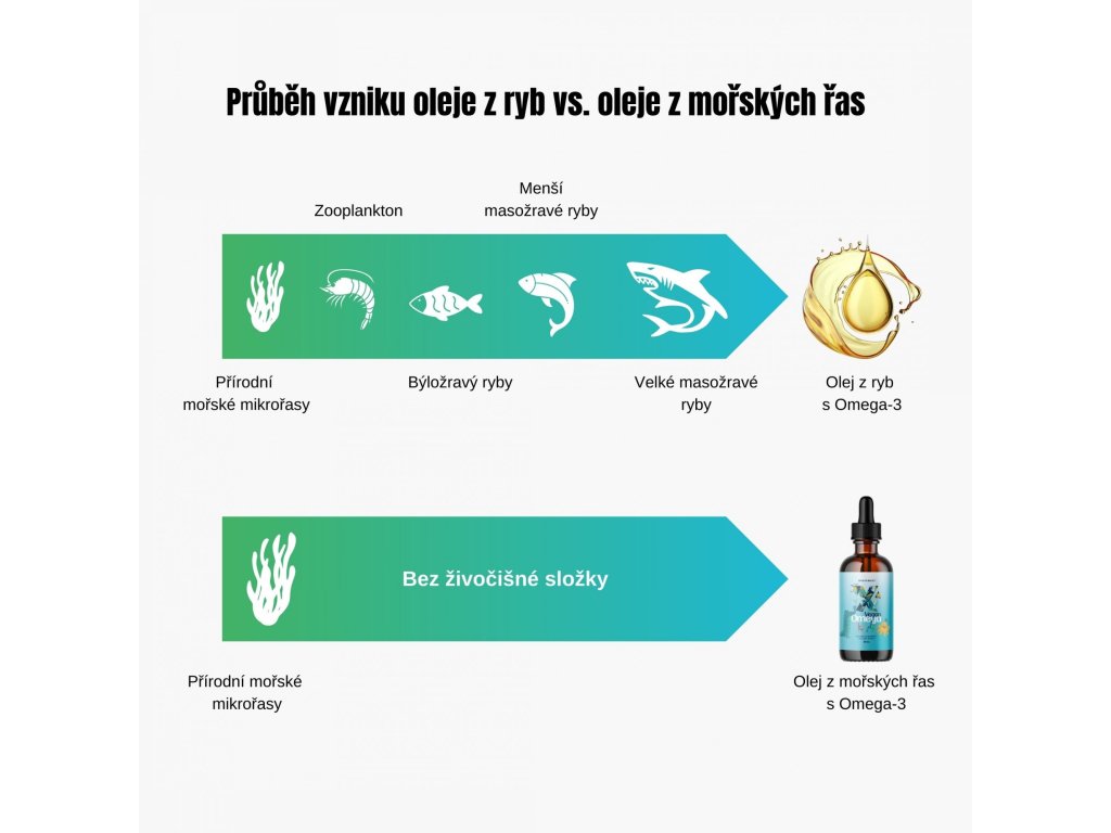 Zapomeňte na konopné semínko a jiné rostlinné zdroje, ze kterých jen velice obtížně získáte DHA, která je esenciální živinou pro zdraví mozku i očí. Nyní je tu olej z řas ALGAE pěstovaný v uzavřeném ekosystému, takže neobsahuje těžké kovy a toxiny. Můžete si být jistí, že všechny ingredience v produktu jsou rostlinného původu, bez kontaminantů, toxinů, za to bohaté na výborně vstřebatelné omega-3 mastné kyseliny. Přestože kyselinu alfa linolenovou (ALA) můžeme získat z chia semínek nebo třeba vlašských ořechů, přeměna ALA na EPA (kyselinu eikosapentaenovou) je maximálně do 9% a u DHA (kyselina dokosahexaenová) dokonce pod 1%! Proto je lepší volit mořské řasy. Ty tvoří nezbytný základ potravního řetězce. A jsou to právě řasy, které ryby konzumují a díky nim jsou následně bohaté na omega 3. Zároveň jsou přirozeným a udržitelným zdrojem omega 3 mastných kyselin. Obsahují nejen vysoké množství DHA a EPA, ale díky přirozeně se vyskytujícím fosfolipidům, které obsahují, jsou mastné kyseliny výborně vstřebatelné. Navíc jsou řasy nositeli chlorofylu. Látky, která podporuje játra v jejich detoxikační činnosti.