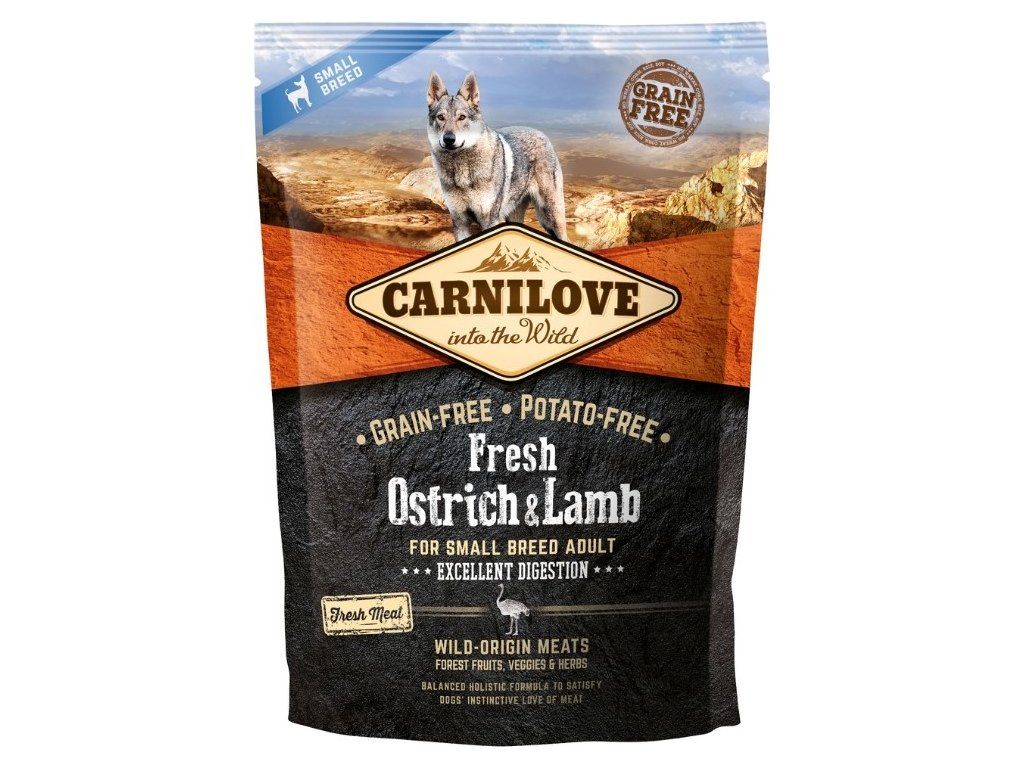 Carnilove Fresh Pštros & Jehněčí superprémiové, holistické krmivo bez obilovin a brambor s čerstvým masem pro dospělé psy malých plemen. Krmivo bylo navrženo s respektem k původní přirozenosti psů tak, aby jim poskytl vyváženou stravu bohatou na čerstvé maso v kombinaci s různými druhy zeleniny, ovoce a bylin