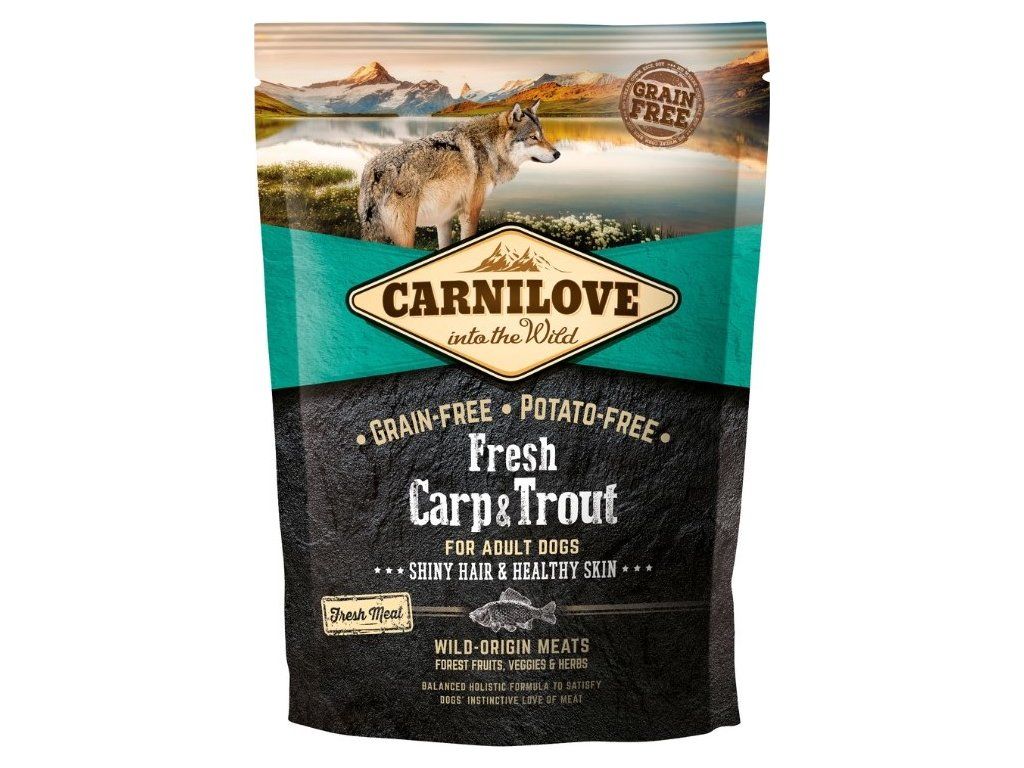 Carnilove Fresh Kapr & Pstruh superprémiové, holistické krmivo bez obilovin a brambor s čerstvým masem pro dospělé psy. Krmivo bylo navrženo s respektem k původní přirozenosti psů tak, aby jim poskytl vyváženou stravu bohatou na čerstvé maso v kombinaci s různými druhy zeleniny, ovoce a bylin