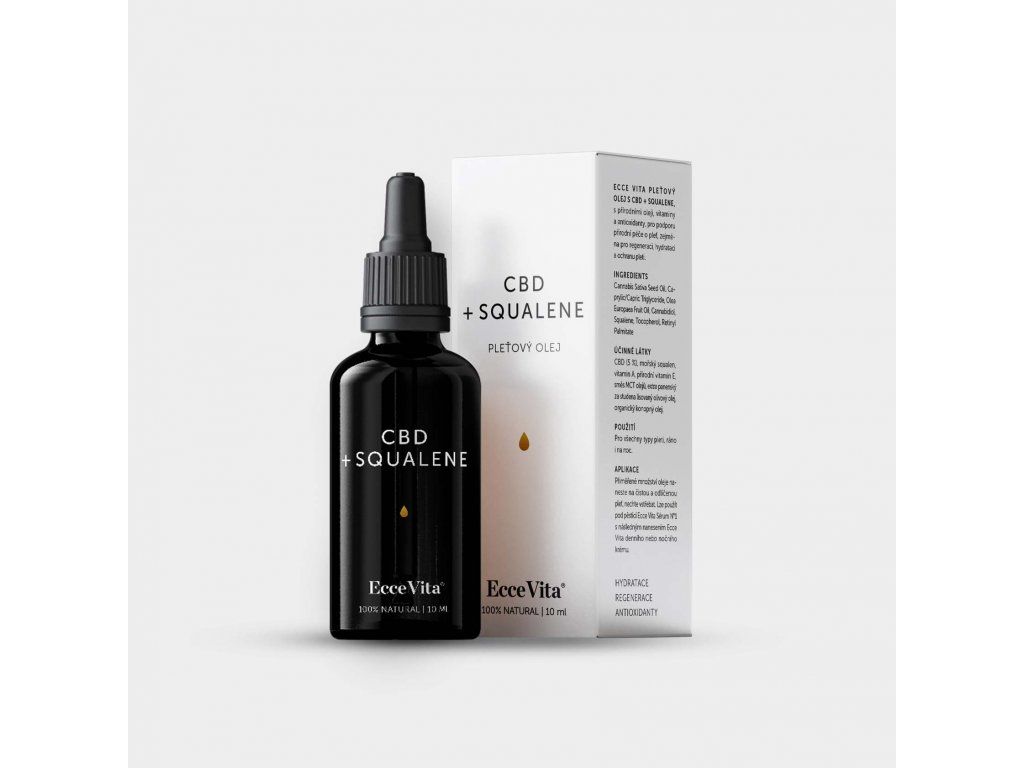 Ecce Vita je pleťový olej. V olejíčku najdete jako hlavní aktivní ingredience 5 % CBD olej a mořský squalen. 100 % Natural