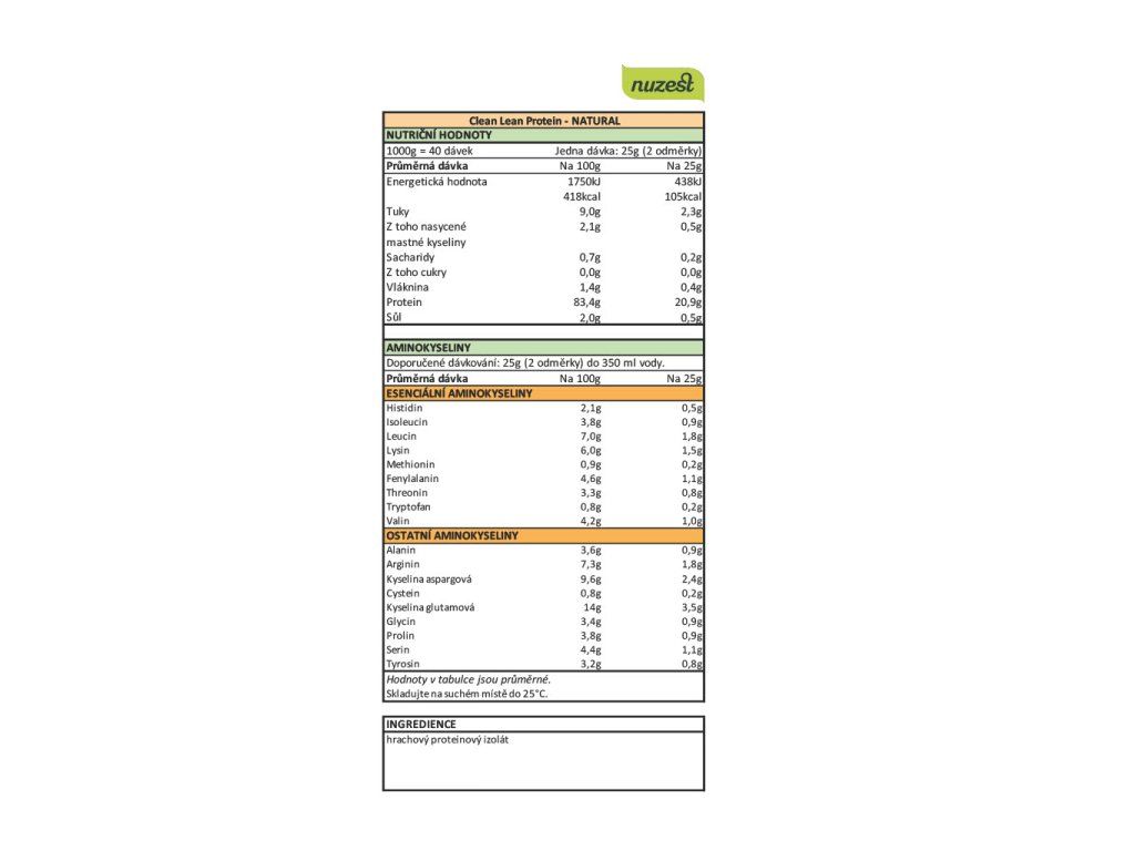 Clean Lean Protein je vyroben z evropského žlutého hrachu pěstovaného v severní Francii. Získáván vodní extrakcí, bez použití chemických látek. Komplexní protein pro regeneraci a energii. Obsahuje všech devět esenciálních aminokyselin. Clean Lean Protein má zvlášť vysoký obsah glutaminu, který má význam pro obnovu svalové hmoty po cvičení a prevenci její ztráty během stárnutí. Zdravá kontrola hmotnosti. Ideální pro regulaci tělesné hmotnosti, Clean Lean Protein je zdravější způsob, jak si udržet pocit nasycení po delší dobu. Svým obsahem aminokyselin je srovnatelný s vaječnými bílkovinami a syrovátkovými proteiny. Lehce se tráví a vstřebává. 98% stravitelnost. Žádný pocit nadýmání. Je zásaditý, s pH 7,8 podporuje rovnováhu ve vašem těle. Mísí se lehce a chutná skvěle! Rychle připravený.