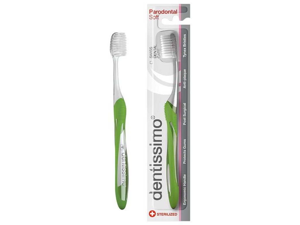 DENTISSIMO® zubní kartáček ParodontálníZ portfolia produktů švýcarské společnosti Medpack Swiss GroupPro dospělé - Měkké mikroštětiny jsou jemné k podrážděným dásním. Přesto umožňují jejich precizní čištění.- Je ideální pro pooperační čištění, při onemocnění dásní a při podráždění dutiny ústní.- Chrání před recesí dásní.DOPORUČENO POUŽÍVAT SE ZUBNÍMI PASTAMI A ÚSTNÍMI VODAMI DENTISSIMO®. Důležité - pro Vaši bezpečKartáček je STERILIZOVÁN během procesu balení.Doplňkové parametry