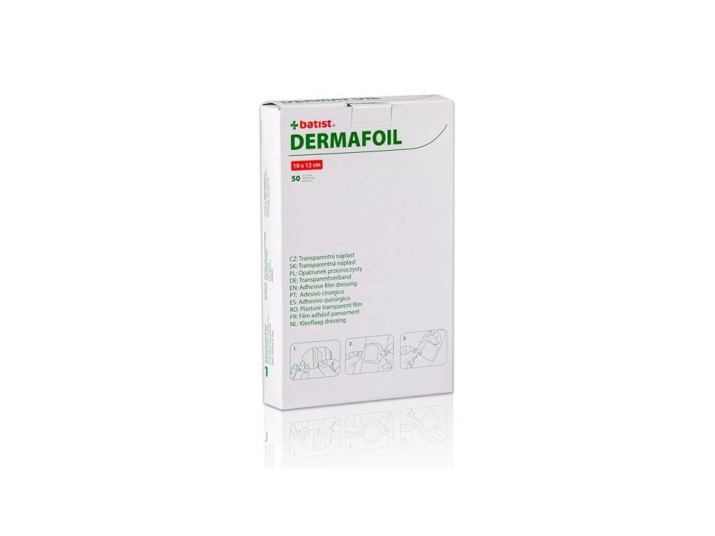 Charakteristika: DERMAFOIL je sterilní průhledná převazová folie, která se dobře přizpůsobuje vaší pokožce. Pomáhá udržovat poranění vlhké a urychluje proces hojení. Díky průhlednosti umožňuje stálé sledování rány, je nepropustná a umožňuje sprchování pacienta. Náplast nabízíme v rozměrech 10 x 12 cm a 6 x 7 cm.Doplňkové parametry