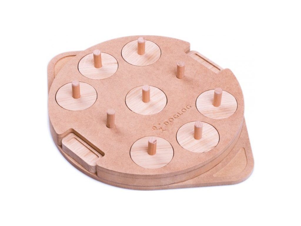 Základ je odstranit hrací kameny. Ty, narozdíl od ostatních hlavolamů, nemají úchyty z provázku, ale jsou také ze dřeva. Kdo by si myslel, že je díky tomu snáz odstraní tlapkou, ten je na omylu. Otvor pro hrací kámen je přesný jako oko tenisového rozhodčí, takže je nutné ho zvednout bezchybným pohybem směrem kolmo nahoru. Ovšem - chceme je také učit a ne jen zabavit, takže na konci přijde malá “zrada”. Poslední dva kameny jsou zablokované. Musí si je odjistit vytažením “tyček” ze hry a teprve pak lze kámen vysunout ven, podobně jako šuplík. Tím se naučí dvoufázovým tahům a připraví se na další hlavolamy vyšších obtížností. V den, kdy zvládne všechny naše logické hry bez použití tlapek, mu kupte kost z Dinosaura a na obojek vyšijte titul “Mistr DogLog”. :)