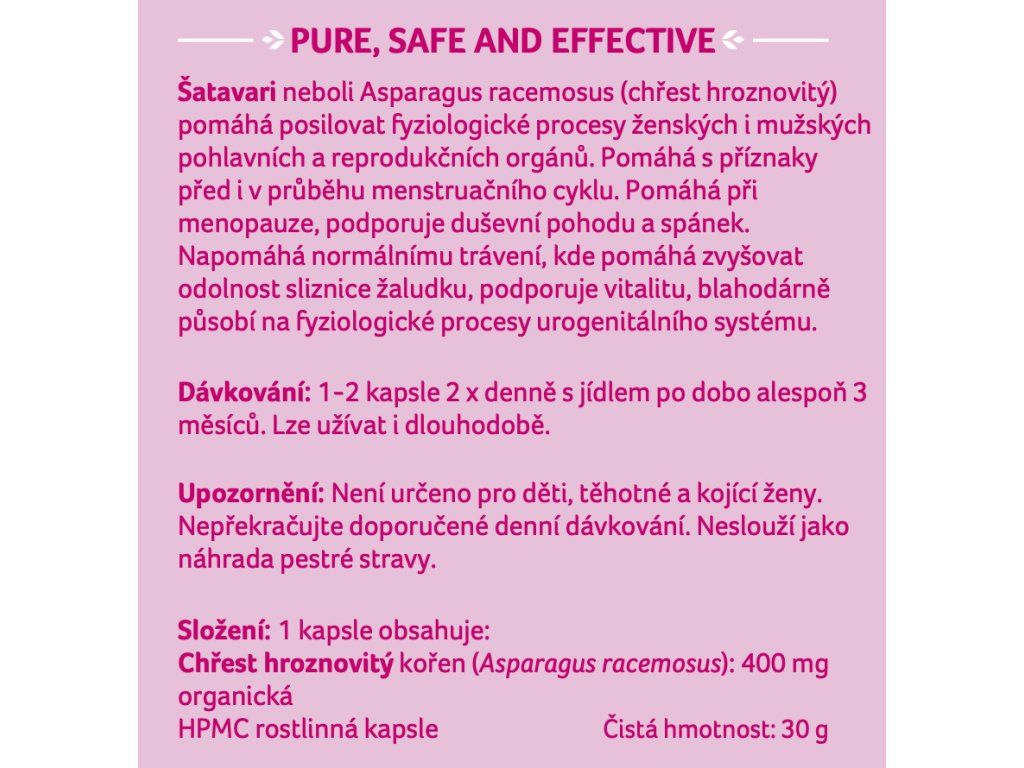 Šatavari (Asparagus racemosus) je ájurvédská bylina známá pro podporu ženského, ale i mužského pohlavního reprodukčního systému. Podporuje menstruační cyklus, vitalitu, duševní pohodu a spánek, chrání před stresem.