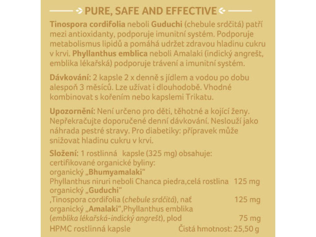Přírodní kapsle z rostlinné celulózy obsahuje pouze sušené byliny a to celou rostlinu Bhumyamalaki známou i pod názvem Chanca piedra, dále nať byliny Guduchi (chybuje srdčitá) a plod Amalaki (embliky lékařské), který patří k významným zdrojům přírodního vitaminu C.