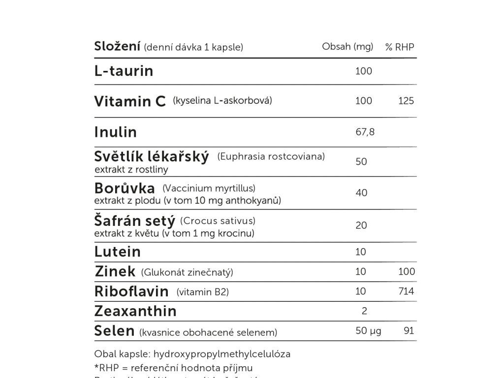 Lutein (10 mg) a zeaxanthin (2 mg): karotenoidy koncentrované v makule oka, podílející se na ochraně citlivých struktur před světelným zatížením.
