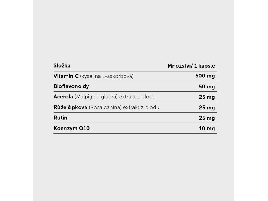 Vitamin C (kyselina L-askorbová), Bioflavonoidy (citrusové, přírodní), Acerola extrakt z plodu (Malpighia glabra), Růže šípková (Rosa canina), Rutin, Koenzym Q10