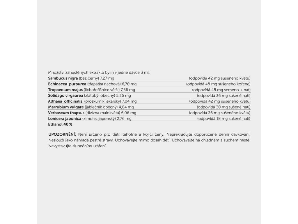 Bez černý (Sambucus nigra), Třapatka nachová (Echinacea purpurea), Lichořeřišnice větší (Tropaeolum majus), Zlatobýl obecný (Solidago virgaurea), Proskurník lékařský (Althaea officinalis), Jablečník obecný (Marrubium vulgare), Divizna malokvětá (Verbascum thapsus), Zimolez japonský (Lonicera japonica), Ethanol 40%