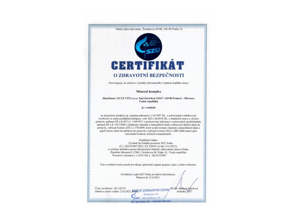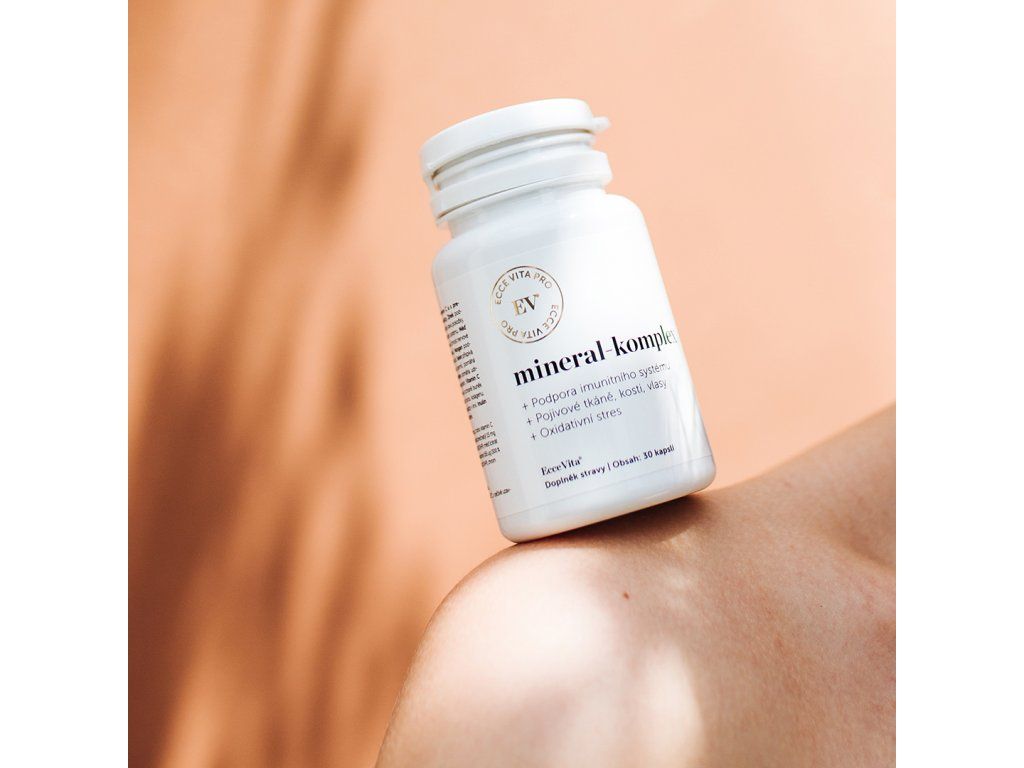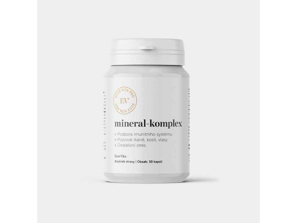 Ecce Vita® Minerál komplex je originální receptura (doplněk stravy), která obsahuje kombinaci 6 důležitých minerálů v dobře vstřebatelných formách s rostlinným vitaminem C a s prebiotickou vlákninou inulinem v kapsli z rostlinné celulózy.Zinek podporuje funkci zraku, přispívá k udržení normálního stavu pokožky, kostí, vlasů a nehtů. Pomáhá udržovat normální hladinu testosteronu v krvi, přispívá k normální plodnosti a rozmnožovací schopnosti. Podporuje funkci imunitního systému. Měď podporuje energetický metabolismus a správnou činnost nervové soustavy. Pomáhá udržovat normální pigmentaci pokožky a vlasů. Mangan podporuje tvorbu pojivových tkání, pomáhá udržovat normální stav kostí. Selen přispívá k normální činnosti štítné žlázy a k tvorbě spermií, podporuje imunitní systém, pomáhá udržovat normální stav vlasů a nehtů.Molybden pomáhá udržovat normální metabolismus sirných aminokyselin. Vitamin C podporuje funkci imunitního systému, přispívá k ochraně buněk před oxidativním stresem. Pomáhá udržovat tvorbu kolagenu pro normální funkci krevních cév, kostí, chrupavek, dásní, kůže a zubů.Chrom přispívá k udržení normální hladiny glukózy v krvi. Inulin slouží jako potrava pro symbiotické střevní baktérie.