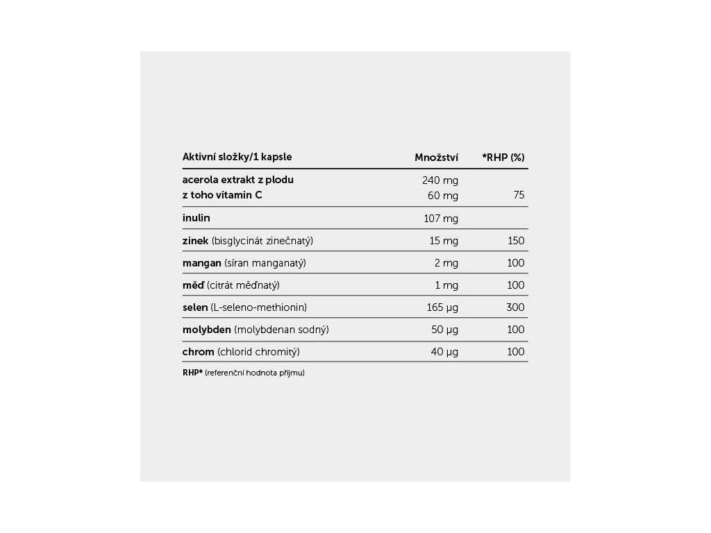 Acerola (přírodní zdroj vitaminu C), Inulín, Zinek (Bisglycinát zinečnatý), Mangan (síran manganatý), Měď (citrát měďnatý), Selen (L-seleno-methionin), Molybden (molybdenan sodný), Chrom (chlorid chromitý)