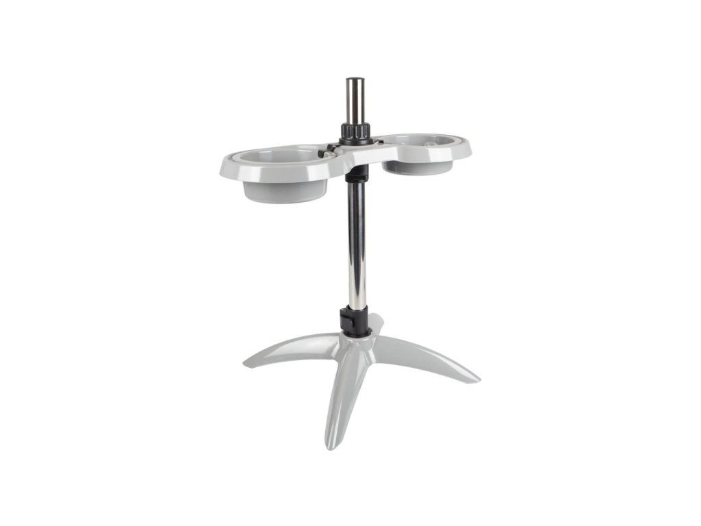 Díky gumovým nožkám je stojan protiskluzový. Misky jsou nastavitelné až do výšky 54 cm a uchytí se pomocí rychlé svorky. Misky lze mýt v myčce.