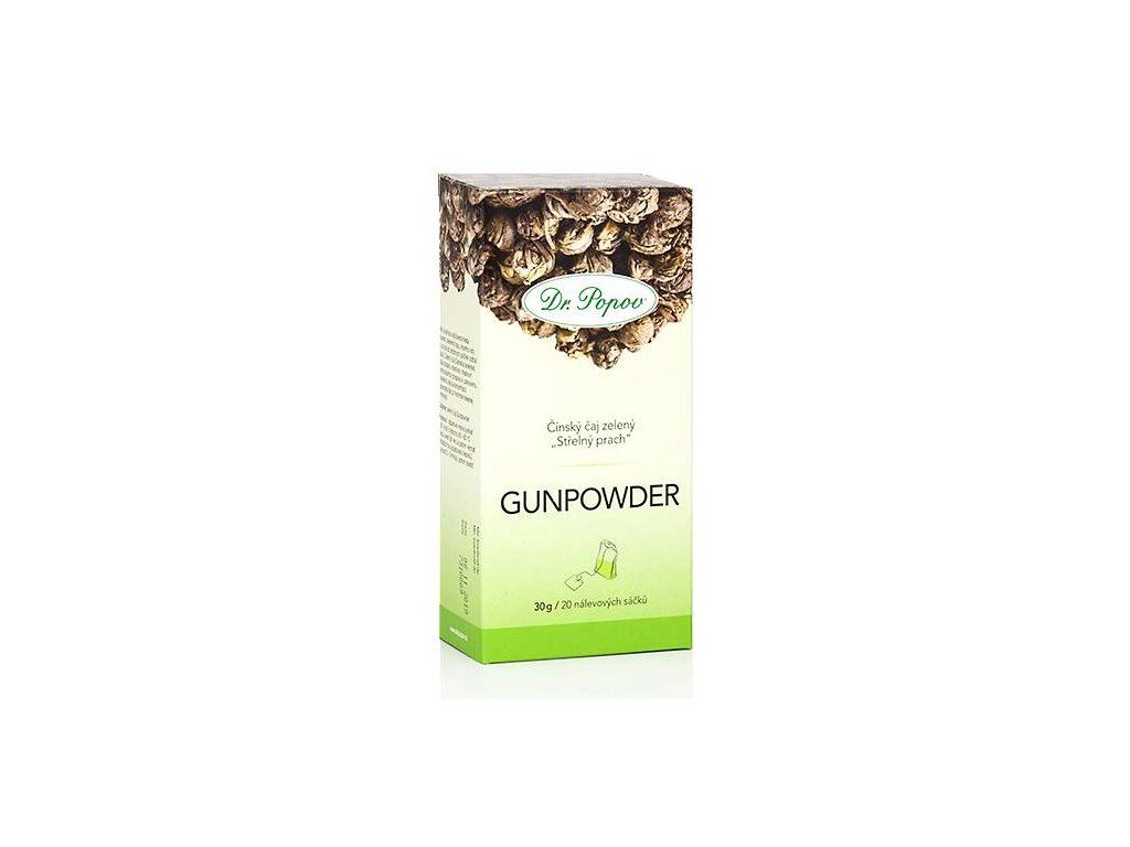 Gunpowder Dr. Popova je velmi kvalitní a oblíbená třída čínského zeleného čaje, jehož listy jsou svinuty do drobných kuliček (odtud pochází název čaje). Zelený čaj díky obsahu vitamínů, tříslovin a antioxidantů povzbuzuje, osvěžuje a přispívá k dobré koncentraci. Zároveň pomáhá mít pod kontrolou váhu