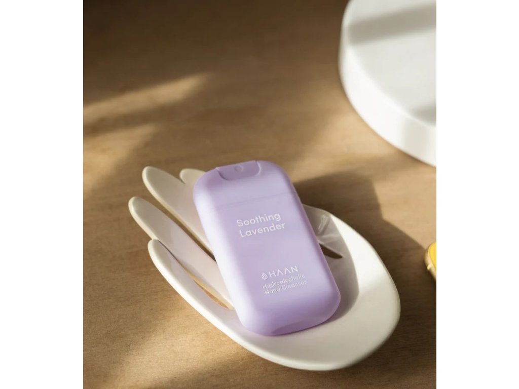 HAAN Soothing Lavander je inovativní antibakteriální sprej na ruce, který důkladně ničí 99,9 % bakterií a virů bez použití vody. Díky vysokému obsahu aloe vera ruce hydratuje, zjemňuje a vyživuje, aniž by zanechával lepivý pocit. Sprej se stane stylovým doplňkem Vaší kabelky díky modernímu a plochému designu, který snadno pasuje do kapsy. Vůně Soothing Lavander kombinuje aromatickou levanduli s jemně kořeněnými a svěžími tóny – uklidňující a osvěžující zážitek pro smysly. Nová receptura obsahuje 99,5 % přírodních složek, je vhodná pro vegany a oproti běžným gelům vydrží až 4× déle díky přesnému dávkování.