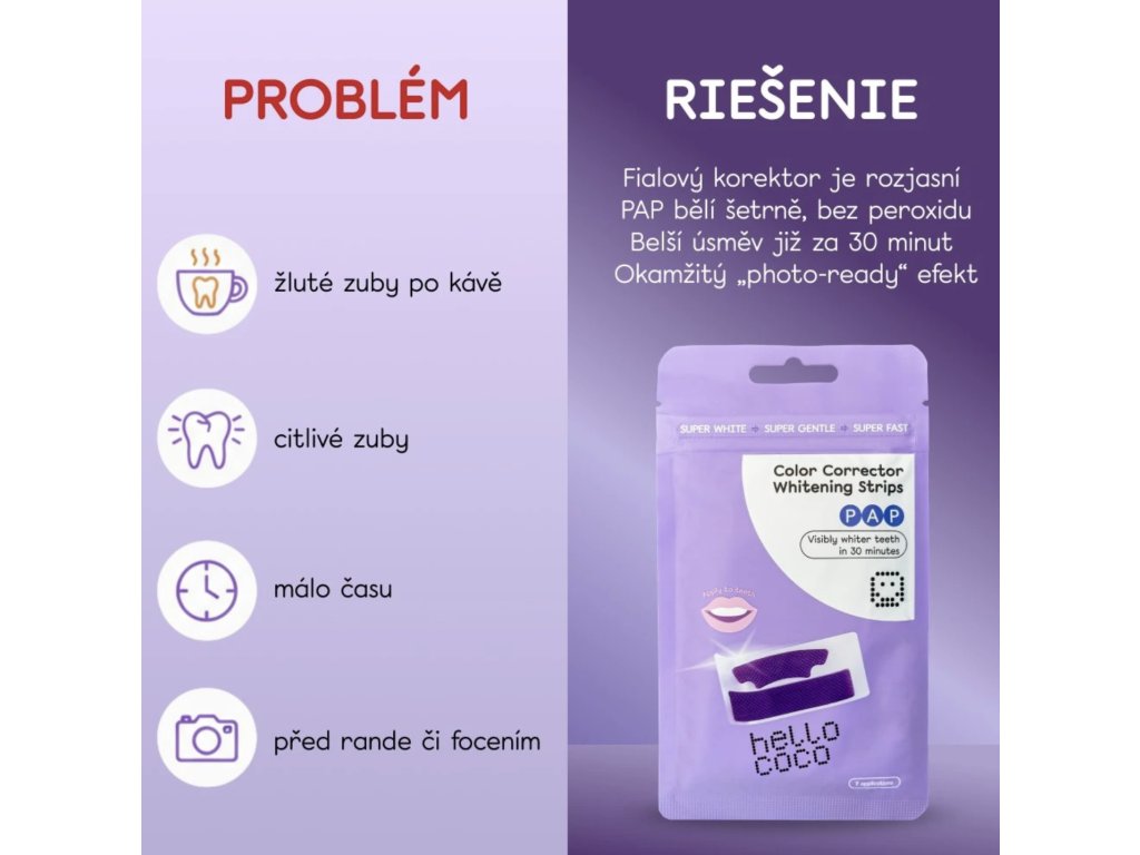 hello coco je značka, která proměňuje přístup k péči o zuby. Pevně věří, že péče o ústní dutinu by neměla být jen rutinní povinností, ale zážitkem, se zaměřuje na zvýšení každodenní péče na úroveň, která nadchne. Jejich produkty jsou vyvinuty s důrazem na účinnost a bezpečnost, přičemž využívají vědecky ověřenou složku PAP jako bezpečnou alternativu k peroxidu. Tato složka umožňuje efektivní bělení bez bolesti a citlivosti zubů, aniž by vyvolávala negativní vedlejší účinky během oxidace zubních skvrn.