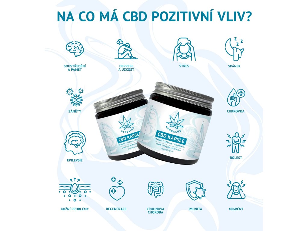 - 1 kapsle odpovídá 2 kapkám 10 % CBD oleje / 4 kapkám 5 % CBD oleje