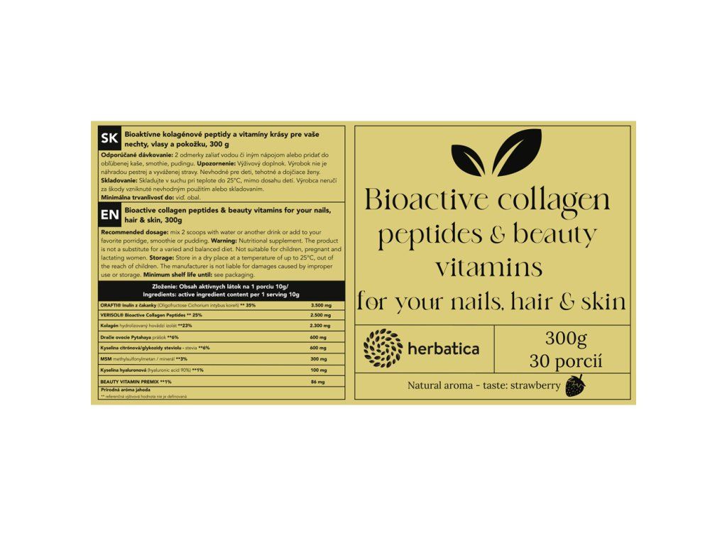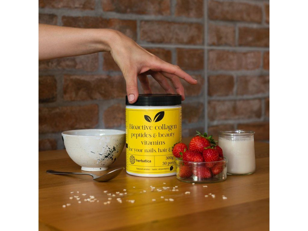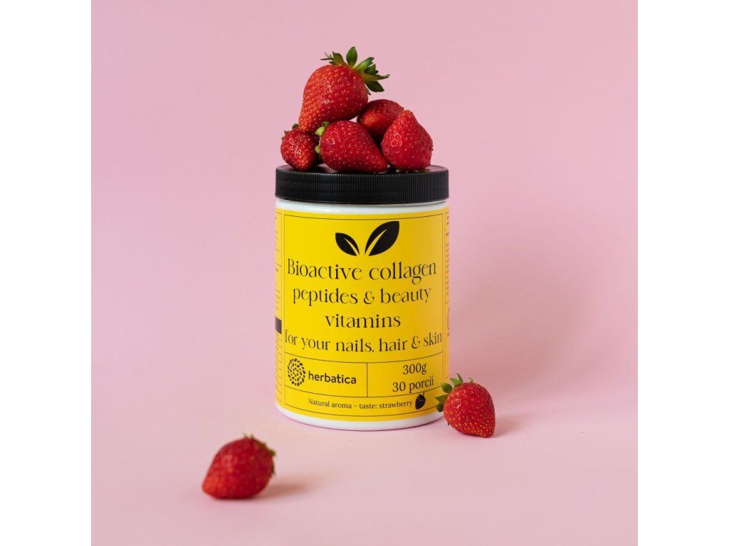 Herbatica Bioaktivní kolagen s peptidy a vitamíny pro krásu, nehty, vlasy a pokožku, jahoda, 300g