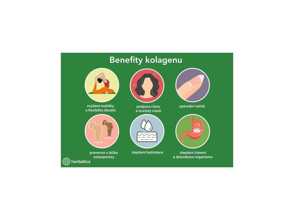 - Kolagen je tělu vlastní bílkovina zdraví a krásy. Nejen sportovně aktivní lidé, ale i střední generace by měli kolagen přijímat pravidelně. Dostatek kolagenu totiž předchází problémům s pohybovým aparátem, zrychluje regeneraci po úrazech a operacích a zlepšuje imunitní funkce (ochrana před infekcemi). Užívání kolagenu má pozitivní terapeutickou roli při osteoporóze, osteoartróze či artritidě, poskytuje ochranný efekt na kloubní chrupavku a především poskytuje symptomatickou úlevu od bolesti. Nedostatek kolagenu navenek zpozorujeme zejména na stavu vlasů, nehtů a pokožky. Vlasy jsou suché, lámavé, pokožka ztrácí elasticitu a nehty se rozštěpí dříve než narostou. Vnitřně se nedostatek kolagenu projeví na strnulosti a ztrátě pružnosti šlach a všech pojivových tkání.