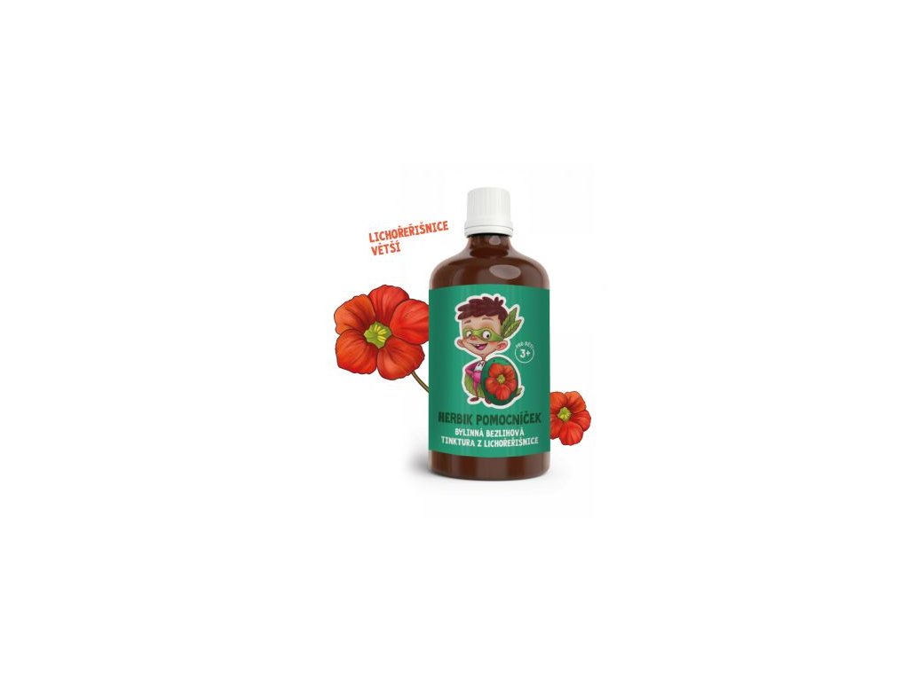 Lichořeřišnice větší (Tropaeolum majus) je jednou z nejpopulárnějších léčivých bylin. V posledních letech se stala v mnoha rodinách nepostradatelnou součástí domácích lékárniček. Proto je tu pro vás a vaše děti speciální tinkturu (Herbik Pomocníček), která neobsahuje žádný alkohol. Můžete ji tak svým dětem podávat bez jakýchkoliv obav, jako prevenci i podporu rekonvalescence při běžných „školkových nemocech“.