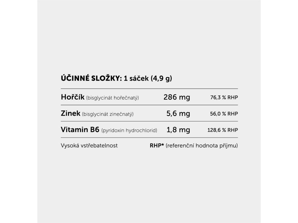 Bisglycinát hořečnatý, kyselina citronóvá, přírodní aroma grapefruit, Bisglycinát zinečnatý, Stearát hořečnatý, Steviolglykosid (přírodní sladidlo), Pyridoxin hydrochlorid