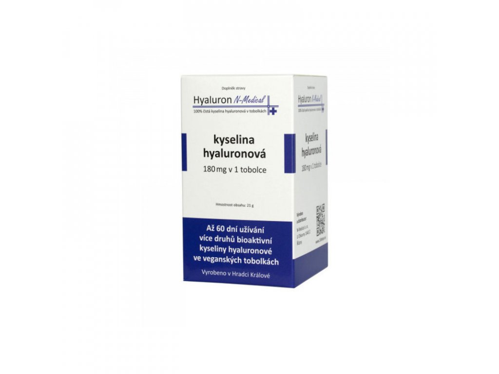 Hyaluron N-Medical cps 30 tobolek (doplněk stravy) je unikátně vyvinutý přípravek pro vnitřní užívání. Hyaluron N-Medical cps je vysoce kvalitní produkt, vyrobený ze 100 % čisté bioaktivní kyseliny hyaluronové. Výroba probíhá za podmínek správné výrobní praxe v Hradci Králové v České republice.