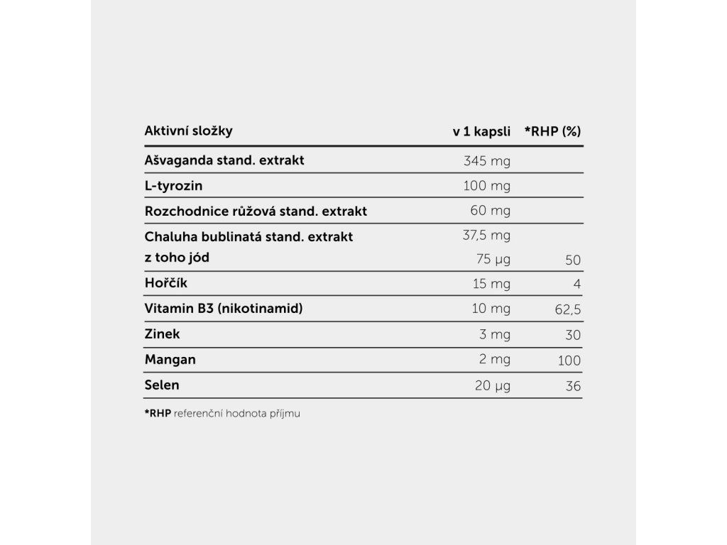Vitánie snodárná (Withania somnifera, Ašvaganda), L- tyrosin, Rozchodnice růžová (Rhodiola rosea), Chaluha bublinatá (Fucus vesiculosis), Hořčík (Bisglycinát hořečnatý), Vitamin B3 (Nikotinamid), Zinek (Bisglycinát zinečnatý), Mangan (síran manganatý), Selen (L-seleno-methionin)