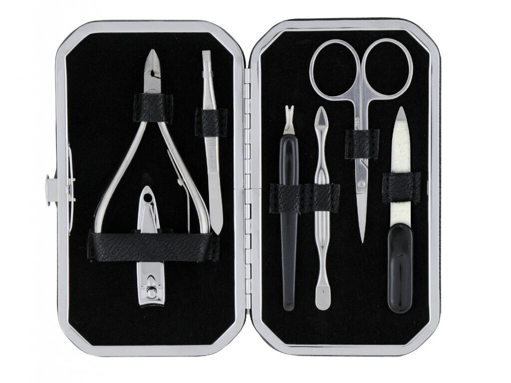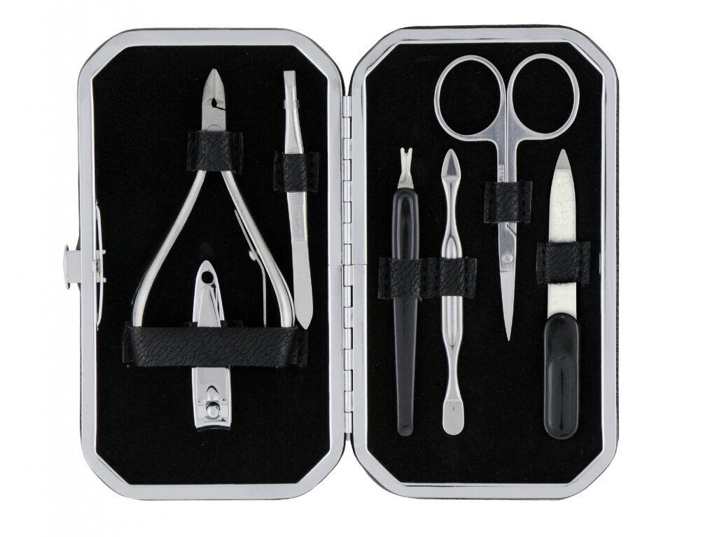 Sada obsahuje nůžky na nehty, kleštičky na nehty, kleštičky na kůžičky, pinzetu, pilník, zatlačovač nehtové kůžičky a ořezávač nehtové kůžičky.