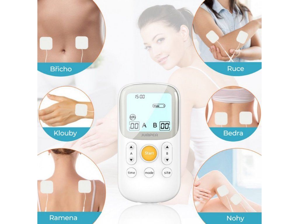 Svalový elektrosimulátor Jumper TENS je terapeutický, rehabilitační a relaxační přístroj pro různé druhy masáže celého těla. Cílí na vaši bolest přesně, účinně a bezpečně. Umístěním elektrodových destiček přesně na místo bolesti získáte rychlou úlevu, aniž byste museli pozřít léky na bolest. Při použití terapie TENS bezpečně a přístroj můžete použít, kdykoli potřebujete.