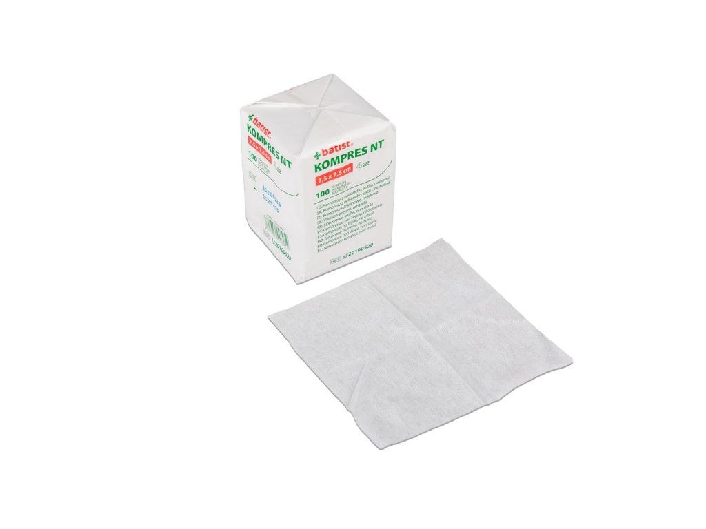 Charakteristika: Kompresy jsou vyrobeny z netkaného textilu o složení 70% viskózy a 30% polyesteru o plošné hmotnosti 30 g/m2. Tkanina je skládána do formy kompresů o čtyřech vrstvách. Balení nesterilního výrobku je po 100 kusech kompresů v papírovém sáčku. Sterilní výrobky jsou dodávány ve sterilním balení a baleny po 2, 5 nebo 10 ks. Použití: Kompresy z netkaného textilu jsou vhodné k prvotnímu ošetření znečištěných a exudujících poranění, jako mechanická bariéra v kombinaci se sterilním krytím ran k všestrannému použití na klinikách i v ambulancích.Doplňkové parametry