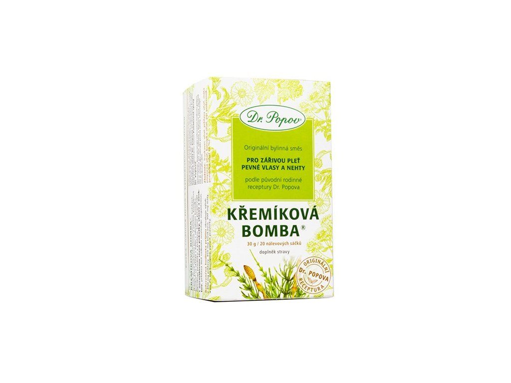Bylinný čaj Dr. Popova Křemíková bomba® obsahuje vyváženou směs bylin, které přispívají ke zdravému stavu pokožky, vlasů a nehtů. Přeslička pomáhá díky mineralizaci tomu, aby naše pleť, ale i vlasy a nehty zůstaly v dobrém stavu. Kopřiva příznivě působí na zdravý stav kůže a podílí se na jejím hojení. Obsahuje řadu minerálních látek, železo a dodává tělu potřebnou energii i vitalitu. Truskavec působí díky obsahu stilbenu a resveratrolu antioxidačně.