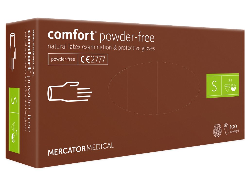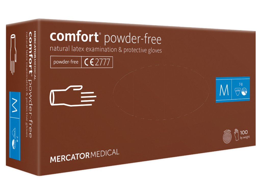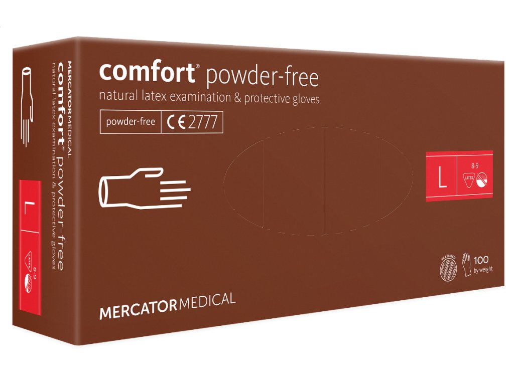Comfort® powder free - jsou diagnostické latexové rukavice bez prášku. Díky vnitřnímu povrchu bez prášku se rukavice snadno nasazují, a to i na mokré ruce. Rukavice Comfort® bez pudru mají texturu, která zajišťuje bezpečné uchopení - také v mastném nebo mokrém prostředí. Pružný latex se přizpůsobí ruce, díky čemuž jsou rukavice velmi pohodlné a neomezují pohyby prstů. comfort® powder-free jsou rukavice se širokou škálou aplikace.
