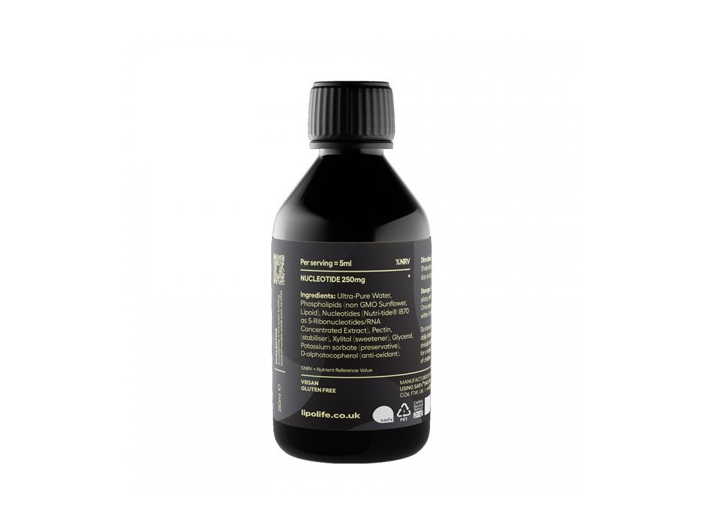 Složení: Nukleotidový komplex (Nutri-tide® IB70 jako 5-ribonukleotidy/RNA koncentrovaný extrakt), fosfatidylcholin ze slunečnicového lecitinu bez GMO, pektin (stabilizátor), xylitol (sladidlo), sorbát draselný (konzervant), vitamín E (antioxidant), stopy glycerolu.