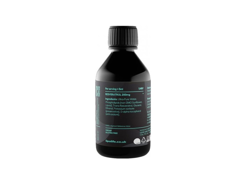 Složení: Trans-resveratrol, fosfatidylcholin ze slunečnicového lecitinu bez GMO, voda, sorban draselný (konzervant), D-alfa-tokoferol (antioxidant), stopy glycerolu a ethanolu.