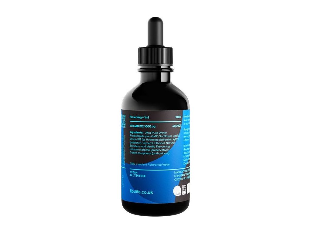 Liposomální B12, fosfolipidy (bez geneticky modifikované slunečnice, lipoid), xylitol (sladidlo), glycerol, ethanol, přírodní jahodové a vanilkové aroma, sorban draselný (konzervant), d-alfa tokoferol (anti-oxidant), ultra čistá voda.