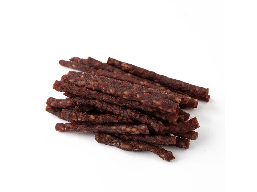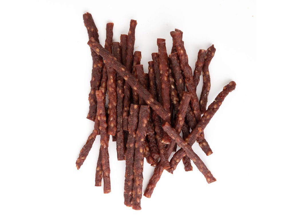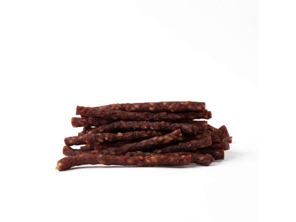 Přírodní masová pochoutka z jehněčího masa formované do měkkých proužků, které se snadno dělí na menší kousky.