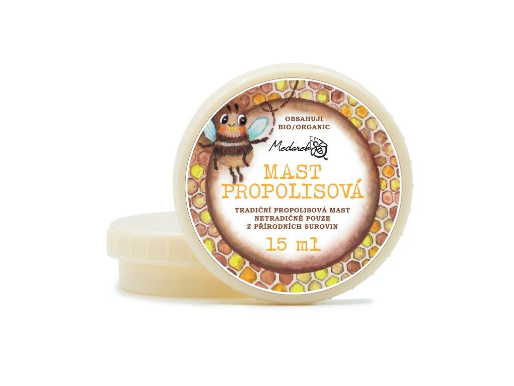 Tradiční propolisová mast vyrobena z přírodních surovin. Klasické propolisové masti mají základ z vazelíny (ropy). Naše propolisová mast má základ z bambuckého másla a mandlového oleje, tuhost pak zajišťuje včelí vosk. Vhodná i pro děti od narození.
